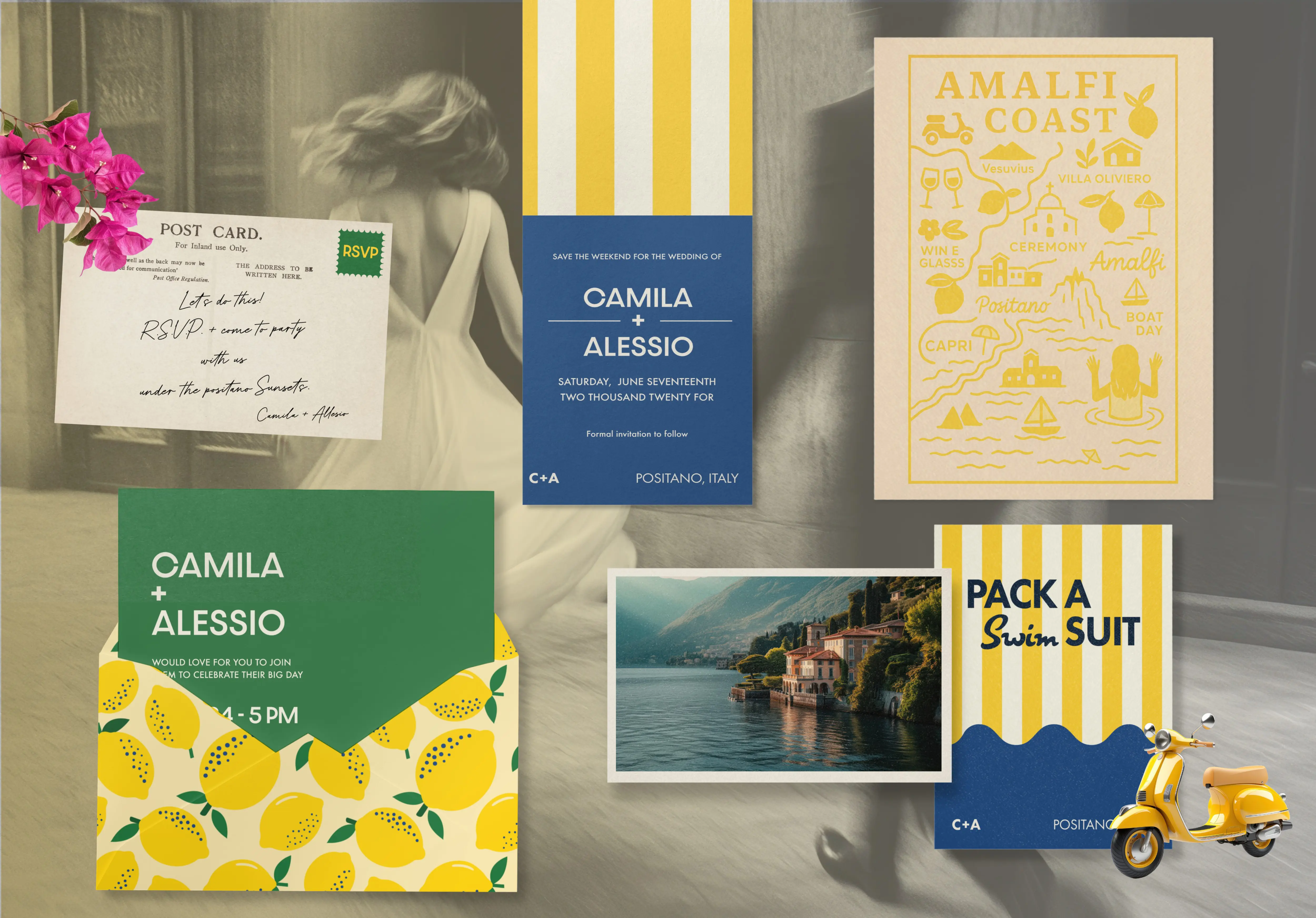 A suite of wedding invites, including beach apparel, gift boxes, totes, and postcards.