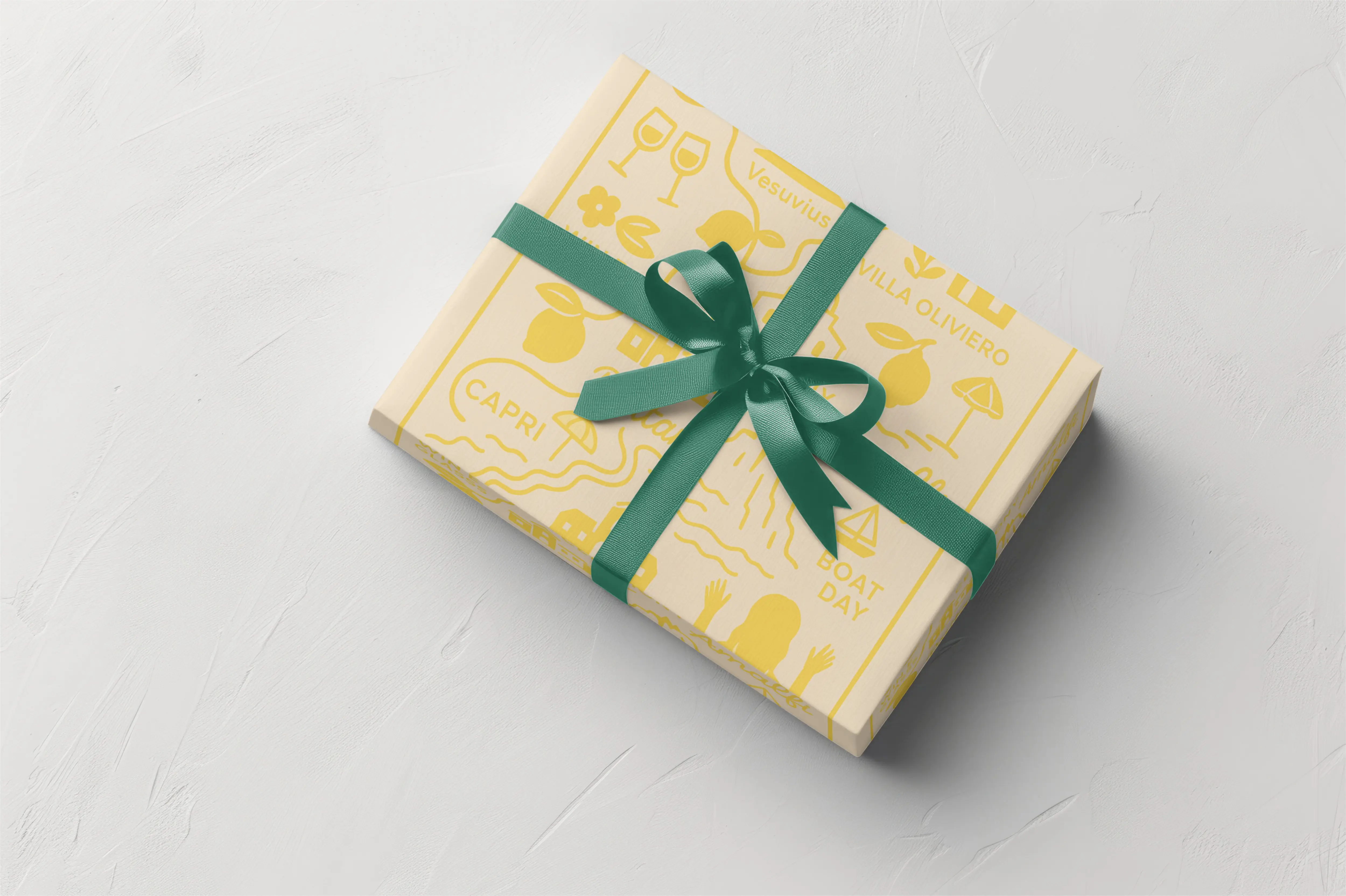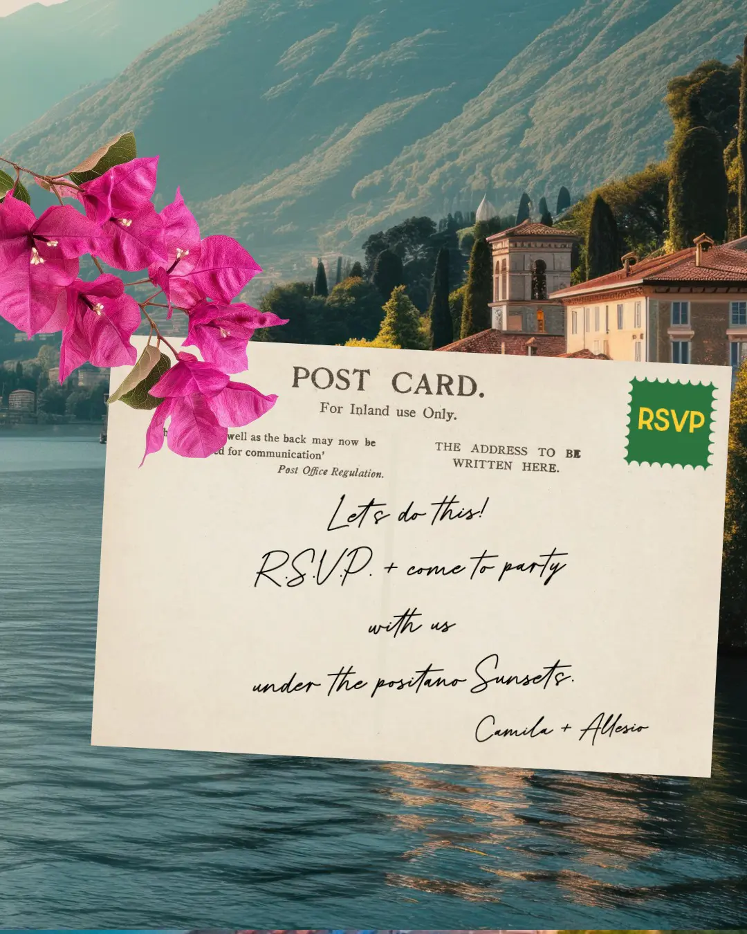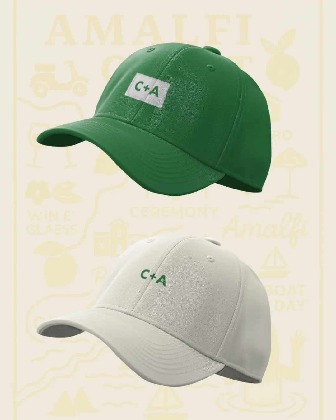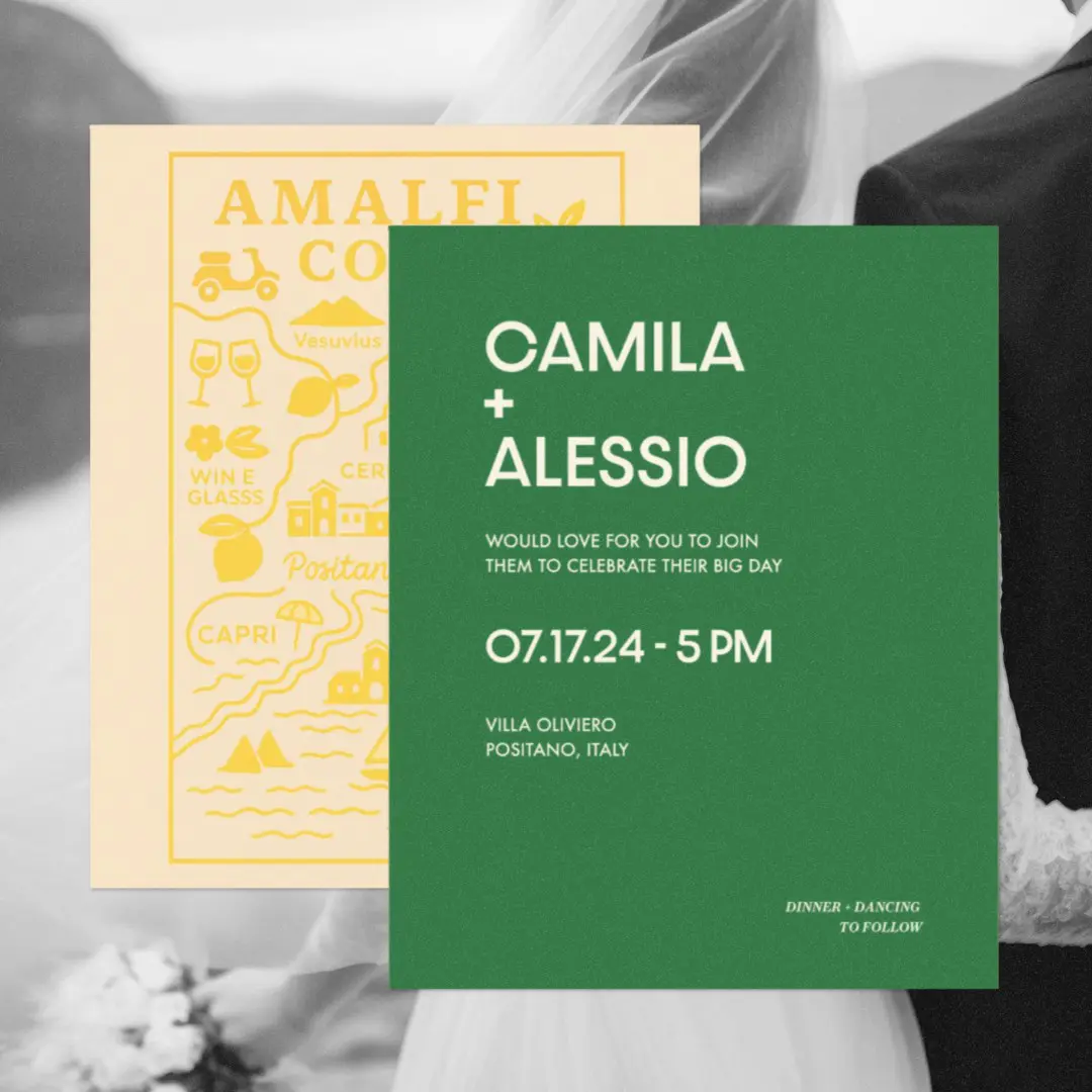 This suite was inspired by Camila and Alessio’s story, which began on the Amalfi Coast — he Italian, she Spanish. The design reflects the region’s warmth through a Mediterranean palette: lemon yellow for Amalfi’s iconic citrus, bougainvillea pink for the flowers that frame the cliffs, and deep ocean blue for the water where they first met. The goal was to blend romance with clean, modern graphics to create a fresh, destination-driven visual identity.