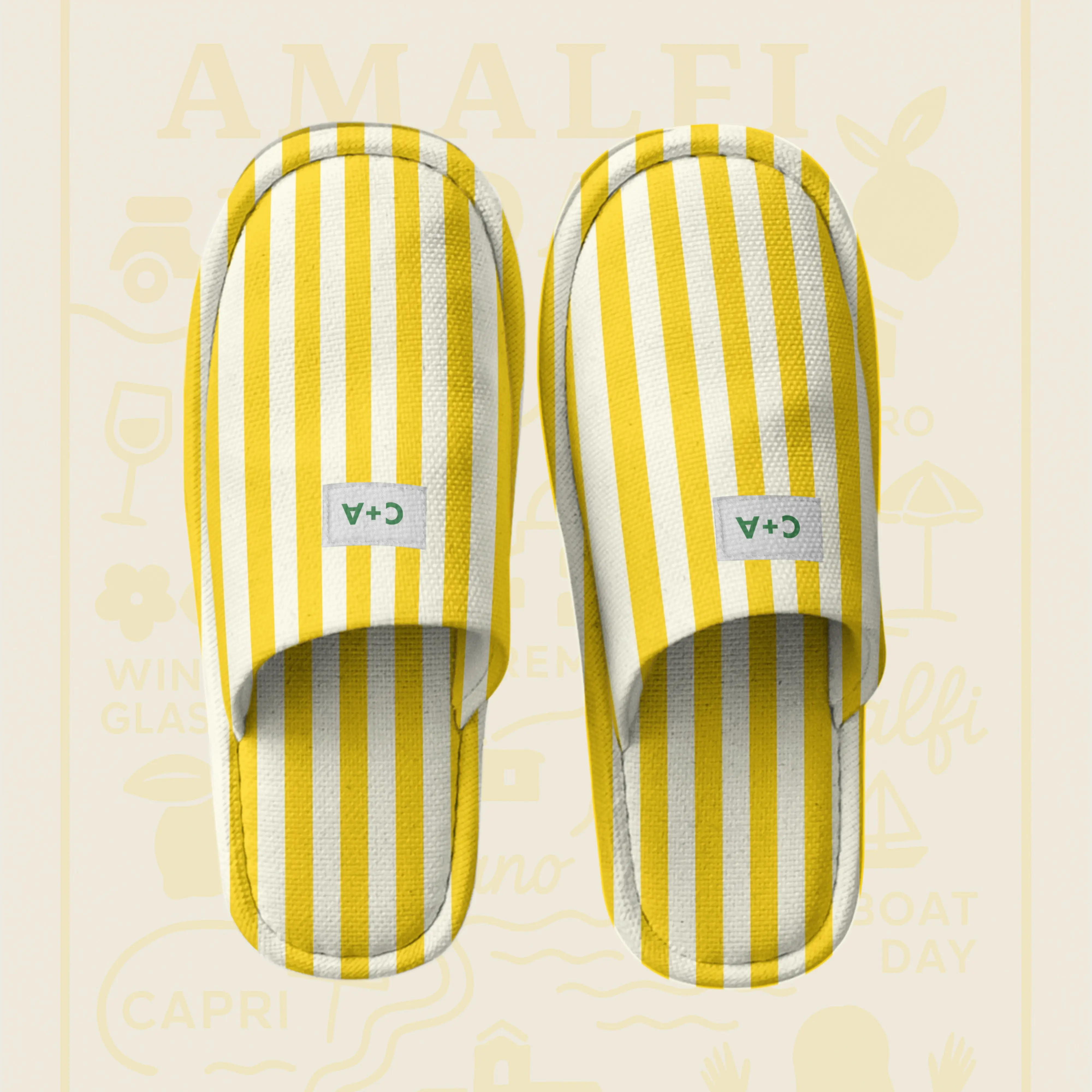 Stripes: Inspired by classic Positano beach umbrellas, used as a bold, unifying graphic element.